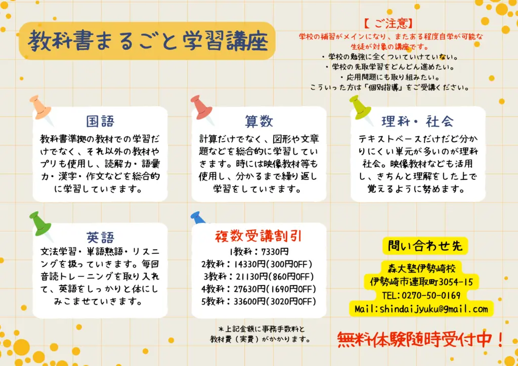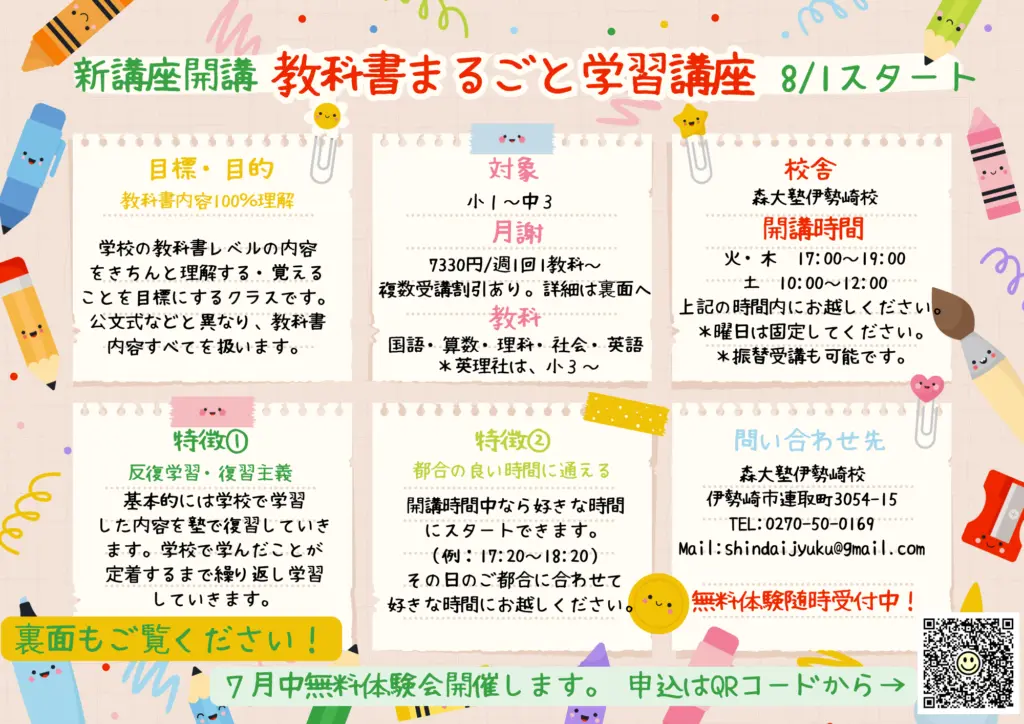 「教科書まるごと学習講座」は、その土台となる「基礎理解と定着」を支える講座です。学校で学ぶ内容をしっかり定着させたい、無理なく繰り返し学びたい、というご家庭には、特におすすめです。
