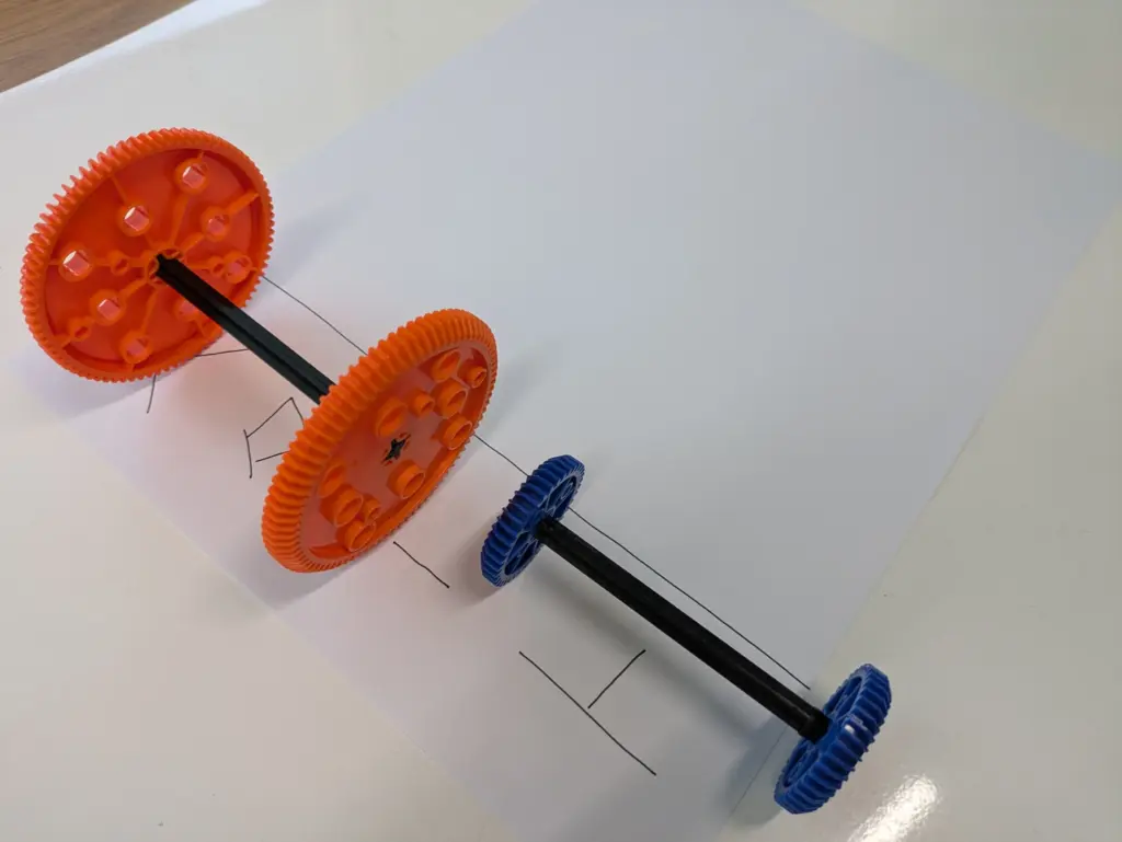 大きさの違う車輪は、同じ太さの車軸を1回転させても、進む距離が違うことや
