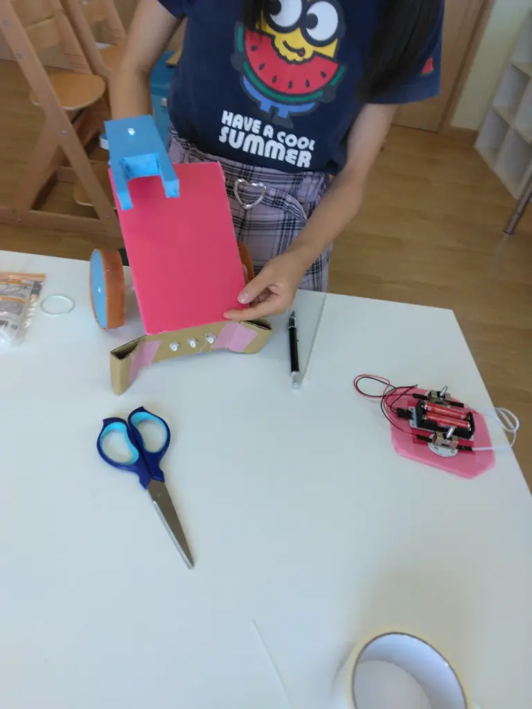 作ったベルトコンベアを電動にしてみたり、クラスのみんなで協力して大きなからくり装置を作ったりもしました。