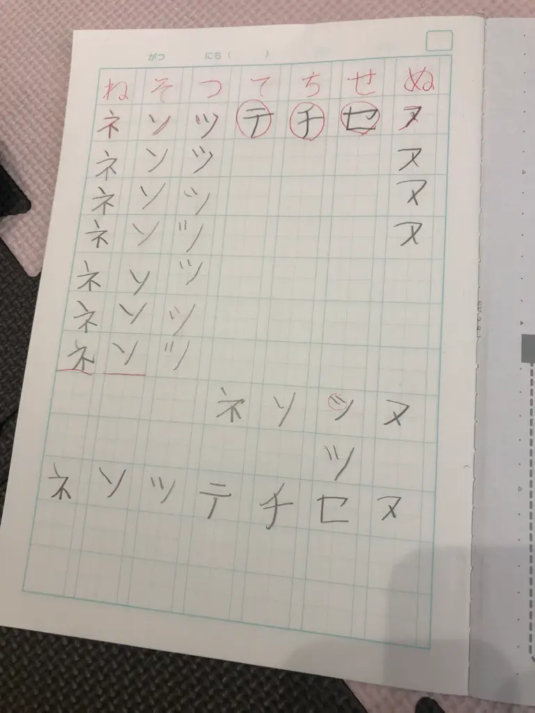 ちなみに、写真は、私が息子にカタカナの勉強をするときに、間違えたものだけピックアップしてやらせたものです。間違えたものだけやらせるので、時短にもなりますし、こどももだんだんやる問題数が減ってくるので嫌がらずに取り組んでくれます。
